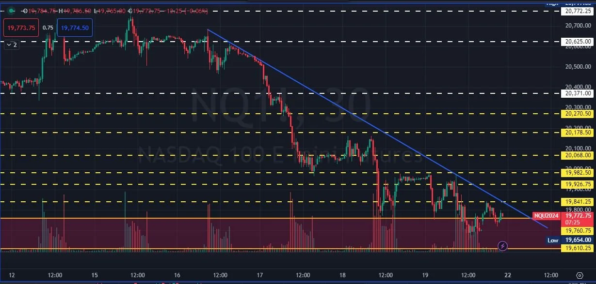 At the time of writing this we are at a key structure level that I have been interested in since the new contract rolled. The zone of 19,760 to 19,610 is that gap. We have yet to fill the gap and by doing so early this week we could see a bounce from here. I am leaning to the 19,760 level to be my bullish/bearish line in the sand to open the week up. If we hold and open Monday below that level we are showing signs of acceptance down to the gap fill. Not only is the long term gap below, we have gapped open from Friday to Sunday and have not filled that level yet, 19,701.50 would be a clean target should that be the case. If that fill does not hold and we push lower Friday’s low is 19,654 and then into 19,610. These levels should act as support if price wants to sweep and move higher. If the bears maintain control, then the next area is the 19,500 price point. Should we catch a bid on the zone and break above this previous weeks downtrend then a bounce up to the 20,100 area is where decisions could be made on weather the bulls regain the momentum or fail and come back down through our gap and lower.