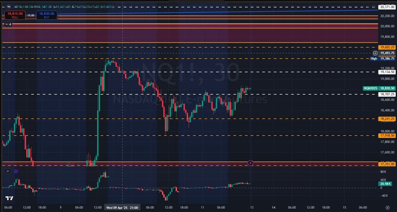 What a time in markets. I have been harping on the headline driven market narrative and I think you can believe me now in what has been just some historic price movements. The start came in when Trump announced the tariffs after hours on April 2. The flood gates opened and selling began to pour in, nearly limit down each day into the weekend and on open last Sunday. We opened with a gap down on fears of a “Black Monday” around the newswires. Like I have mentioned, when you get that fear in the public eye you may get that opposite reaction, sure enough Black Monday did not happen and we recovered the gap down. As the week progressed we were in a constant state of potential limit down behavior and never got that halt. One fake tweet led to a huge bounce, and then the real 90 day pause came in and we went on to have the second largest daily move in NQ history on Wednesday. Thursday seemed to be more of a technical pullback after such a huge move on Wednesday but still was living on headlines and political chatter. Finally after such wild volatility Friday was a day of rest. We stayed inside all day and understandably I do not believe participants wanted to go into the weekend with big positions on. This might have been a good choice as we got some headlines coming in yesterday that could gap us up big on open today.